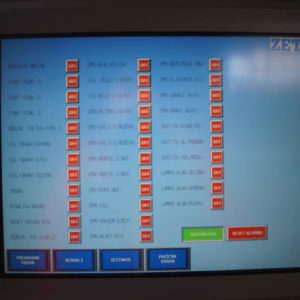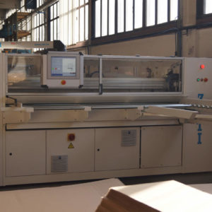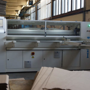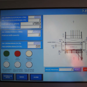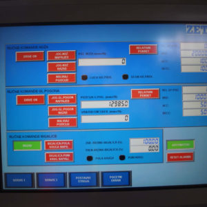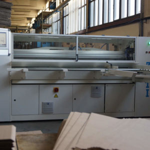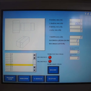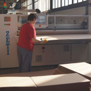 Workers are manually feeding corrugated board in the machine. The feeding reel takes over the sheets and positions them computerized, fully automatic, very precise, and fast for the individual work segments and tools. Cutting edge PLC program is controlling the main drive as well as tools and other functions, which are set up for optimal work flow. This set up enables simultaneous or individual workflow of different machine functions saving time and increasing the manufacturing speed by regulating the production at high speeds without loss of precision. Modern and simple machine controls through touch screen unit and work memory computer for order savings enable input and controlling of all work flow sequences over the industrial PC, allowing fast order changes, efficient follow up on all production steps, as well as machine status tracking. Connection of PLC program over a direct and safe Internet connection with the ZETI Support Center ensures maximum technical support and production safety. Completed sheets leave the machine through